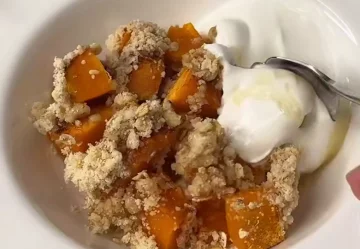 Подавайте крамбл теплим, з ложкою холодного йогурту чи кулькою ванільного морозива – контраст температур робить десерт особливо затишним. Простота, аромат та смак осені в кожній ложці.