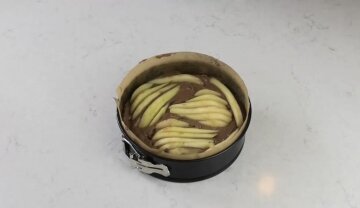 Перекладіть тісто у рознімну форму діаметром 20 см, вистелену пергаментним папером, і розрівняйте верх. Викладіть зверху фрукти, намагаючись зберегти форму цілої груші.