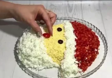 Викладіть салат шарами у формі Санта Клауса – це не лише красиво, але й створює святковий настрій.