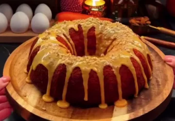 5. Поки кекс остигає, змішують цукрову пудру з апельсиновим соком і додають трохи куркуми. Вона тут не для смаку, а для кольору — щоб глазур була теплою, сонячною, нагадуючи, що зима не вічна. Глазур має вийти густою, але плинною. Її наносять на вже охололий кекс, даючи їй красиво стікати з боків.