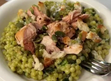 Подача: На тарелку выкладываем птитим, сверху — сочную форель, посыпаем тыквенными семечками и хрустящими хлебными крошками. Немного зелени и капелька лимонного сока — и ужин готов!