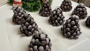 3. Как только конусы готовы, наступает самая интересная часть – украшение! Используйте шоколадные хлопья для создания эффекта чешуи на шишках. Для финального акцента присыпьте десерт сахарной пудрой, это имитирует снежный покров и придает изящный вид.
