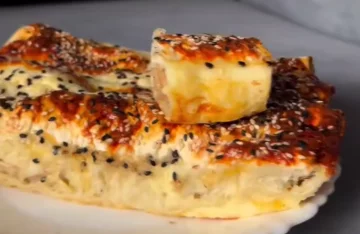 Теперь очередь заливки — именно она делает пирог таким нежным. В отдельной миске взбиваем оставшиеся два яйца, добавляем греческий йогурт, тёртый сыр и примерно 100 миллилитров воды или молока. Смесь должна быть текучей, но насыщенной. Этим соусом заливаем нашу "улитку" так, чтобы он проник между всеми слоями лаваша.