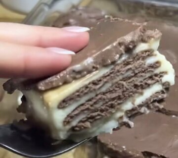 Теперь переходим к формированию самого торта. Возьмите удобную форму (можете использовать пластиковый контейнер или керамическую форму для запекания). Выкладывайте слоями крем и печенье, повторяя этот процесс до тех пор, пока все количество крема не будет использовано. Завершающий слой должен быть кремовым.