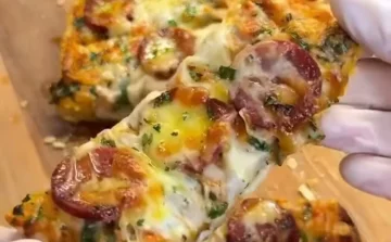 Сборка пиццы. Равномерно распределите яичную заливку по поверхности батона, чтобы она полностью покрывала его. Далее выложите кружочки колбаски или салями. Завершите слоем натертого сыра, щедро посыпав батон сверху.